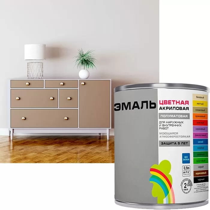 Защищает поверхность атмосферостойким и прочным покрытием. Защита до 5 лет. Представлена в 14 готовых цветах: белый, бежевый, серый, голубой, оливковый, оранжевый, красный, синий, сиреневый, желтый, черный, салатовый, зеленый, коричневый. В краткие сроки можно обновить мебель, интерьер и предметы декора. Подходит для металла, дерева, бетона и кирпича, а также для окраски поверхностей из гипсоволокна, гипсокартона, ДВП, ДСП, фанеры, МДФ. Обладает великолепной адгезией и отличной укрывистостью. Преимущества: Без запаха, не токсичная, пожаровзрывобезопасная. Безвредная для здоровья и окружающей среды. Великолепная адгезия, отличная укрывистость, высокая прочность и долговечность.