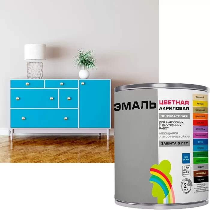 Защищает поверхность атмосферостойким и прочным покрытием. Защита до 5 лет. Представлена в 14 готовых цветах: белый, бежевый, серый, голубой, оливковый, оранжевый, красный, синий, сиреневый, желтый, черный, салатовый, зеленый, коричневый. В краткие сроки можно обновить мебель, интерьер и предметы декора. Подходит для металла, дерева, бетона и кирпича, а также для окраски поверхностей из гипсоволокна, гипсокартона, ДВП, ДСП, фанеры, МДФ. Обладает великолепной адгезией и отличной укрывистостью. Преимущества: Без запаха, не токсичная, пожаровзрывобезопасная. Безвредная для здоровья и окружающей среды. Великолепная адгезия, отличная укрывистость, высокая прочность и долговечность.