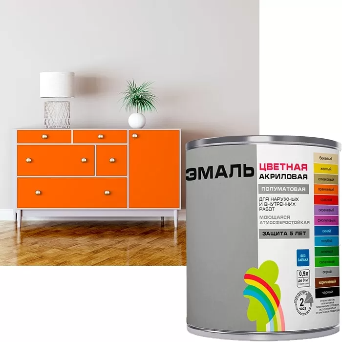 Защищает поверхность атмосферостойким и прочным покрытием. Защита до 5 лет. Представлена в 14 готовых цветах: белый, бежевый, серый, голубой, оливковый, оранжевый, красный, синий, сиреневый, желтый, черный, салатовый, зеленый, коричневый. В краткие сроки можно обновить мебель, интерьер и предметы декора. Подходит для металла, дерева, бетона и кирпича, а также для окраски поверхностей из гипсоволокна, гипсокартона, ДВП, ДСП, фанеры, МДФ. Обладает великолепной адгезией и отличной укрывистостью. Преимущества: Без запаха, не токсичная, пожаровзрывобезопасная. Безвредная для здоровья и окружающей среды. Великолепная адгезия, отличная укрывистость, высокая прочность и долговечность.