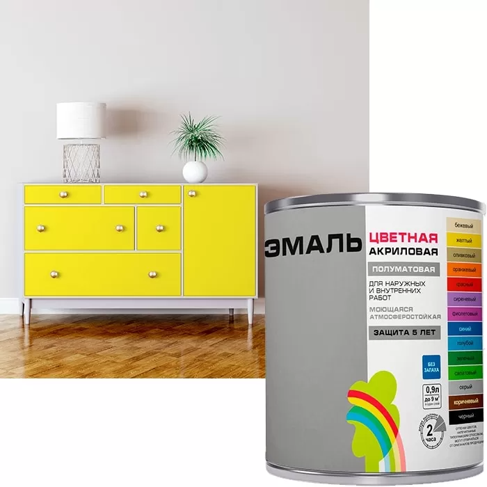 Защищает поверхность атмосферостойким и прочным покрытием. Защита до 5 лет. Представлена в 14 готовых цветах: белый, бежевый, серый, голубой, оливковый, оранжевый, красный, синий, сиреневый, желтый, черный, салатовый, зеленый, коричневый. В краткие сроки можно обновить мебель, интерьер и предметы декора. Подходит для металла, дерева, бетона и кирпича, а также для окраски поверхностей из гипсоволокна, гипсокартона, ДВП, ДСП, фанеры, МДФ. Обладает великолепной адгезией и отличной укрывистостью. Преимущества: Без запаха, не токсичная, пожаровзрывобезопасная. Безвредная для здоровья и окружающей среды. Великолепная адгезия, отличная укрывистость, высокая прочность и долговечность.