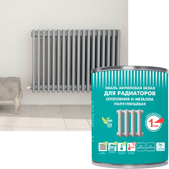 Полуматовая эмаль для окрашивания предварительно подготовленных поверхностей радиаторов и труб отопления, а также металлических, минеральных и деревянных поверхностей внутри и снаружи помещений.