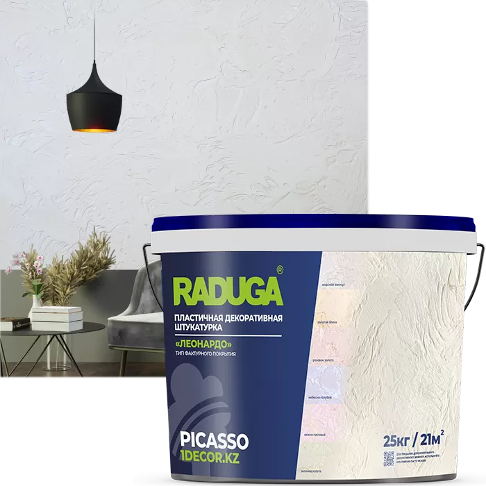 Поможет создать роскошный узор в полюбившемся многим стиле «Леонардо». Актуальна для новостроек в сейсмоактивной зоне за счет высокой эластичности: штукатурка прочна и скрывает трещины до 1 мм и мелкие дефекты поверхности. Можно мыть чистящими средствами. Экологична и безвредна для здоровья. Для придания новых оттенков и подчеркивания фактуры штукатурки рекомендуем нанести поверх креативную пасту Picasso (Пикассо).